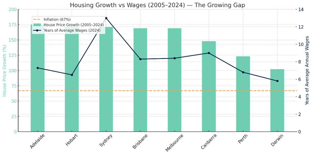 Fifty years ago, in 1975, Sydney homebuyers needed 4.2 times average ordinary time earnings ($7,600 per annum) to buy a home. By 2024, the average ordinary time earnings were higher ($102,000 per annum), but so were average house prices, and they’ve risen at an astronomical rate to 13 times the average yearly income. Similar trends are seen in Melbourne (from 3.5 to 8.4 times) and Brisbane (from 2.9 to 8.3 times). Nationally, the ratio has climbed from 3.4 to 8.1 times, helping explain why younger Australians are struggling to save and afford a home amidst rising living costs (Source: Surprising winners from first-ever study into Australian property values, The Australian Property Institute, 2025).